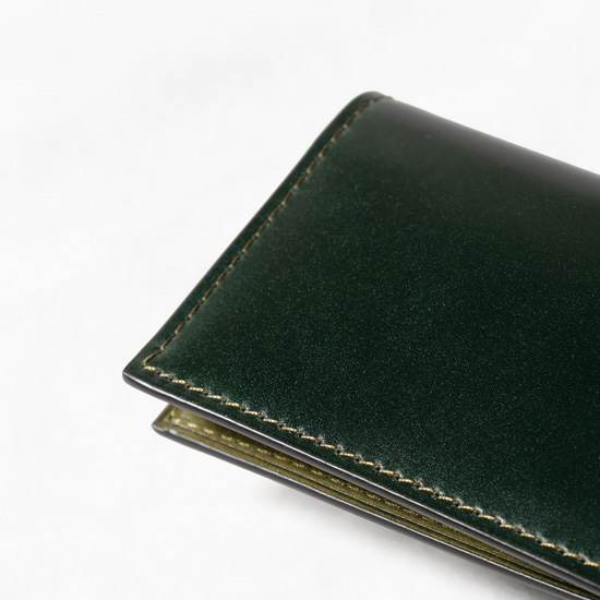 コードバンは牛革に比べ何倍も強靭でありながら、銀面は繊細なガラスの様な輝きを放つツヤ感が大きな特徴。