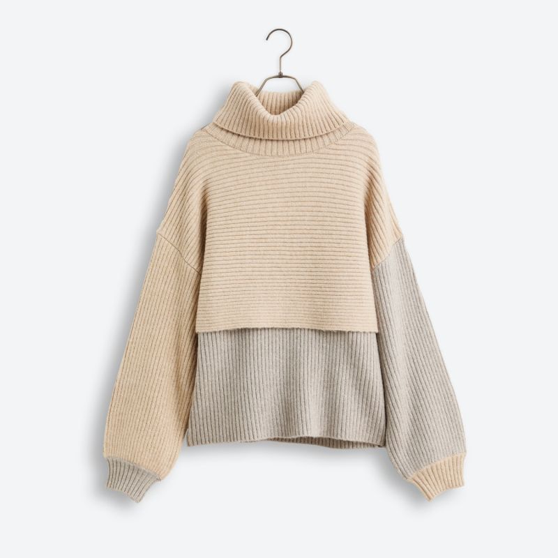 横編み柄のタートルと縦編み柄のノースリーブで同素材に変化をつけました。