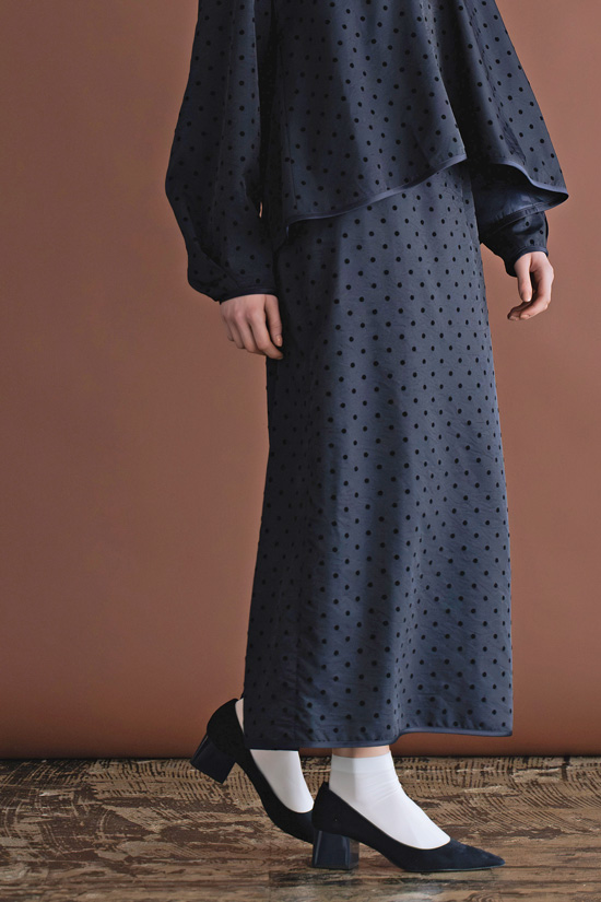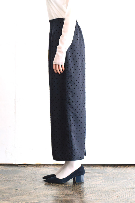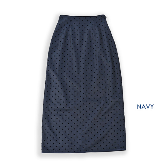 柔らかな光沢感とシャリ感のあるナイロンポリの混紡素材のタイトスカート。