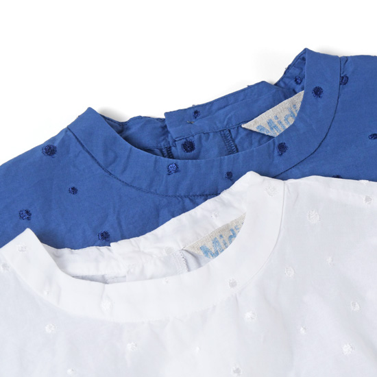 ボディー全体にドット柄の刺しゅうを施したプルオーバーワイドシャツ。