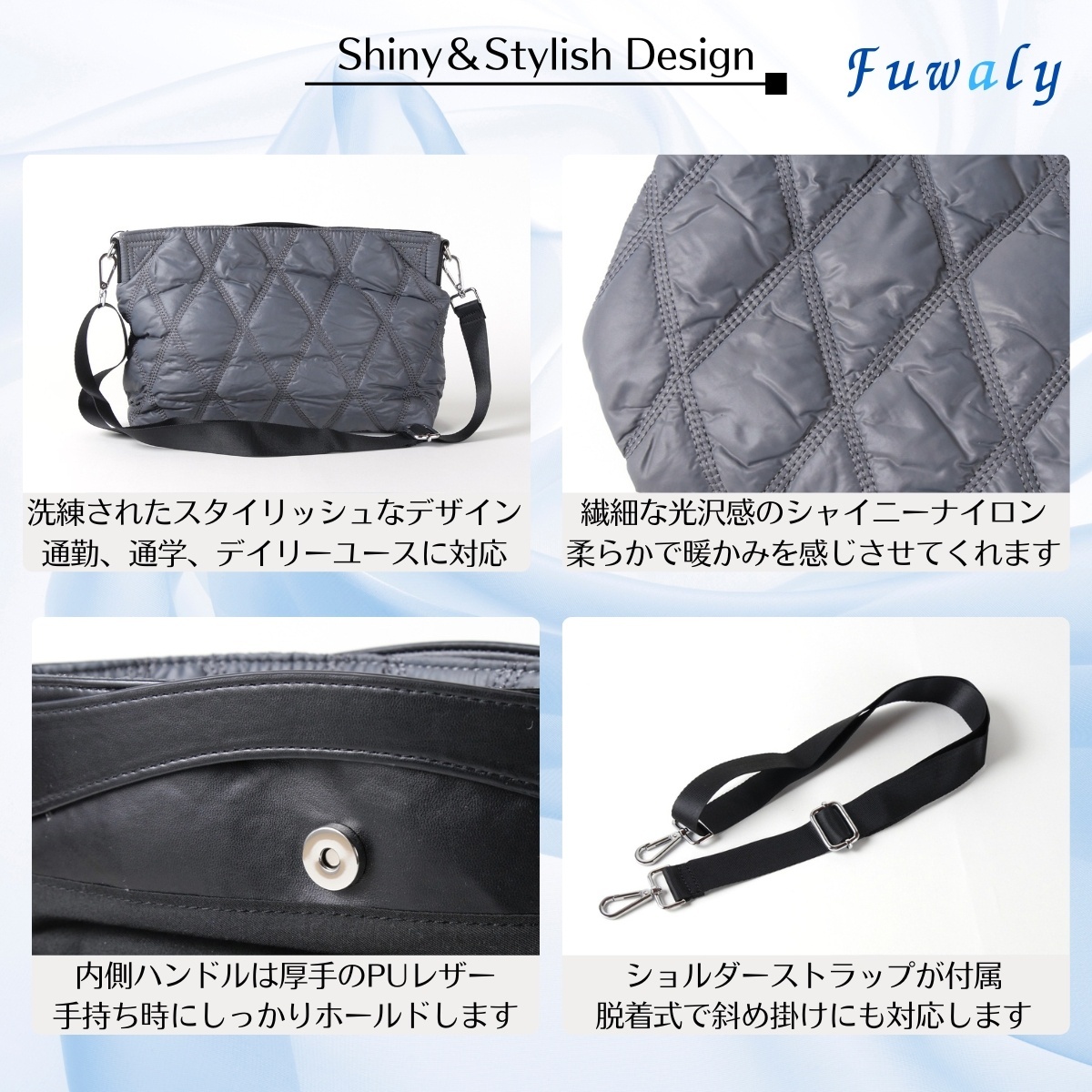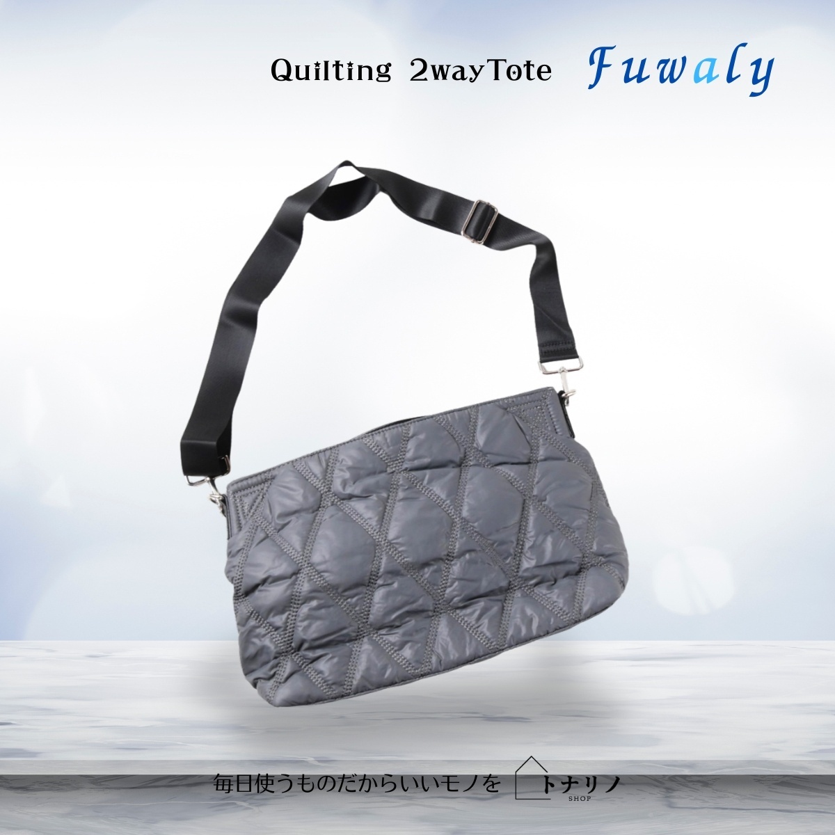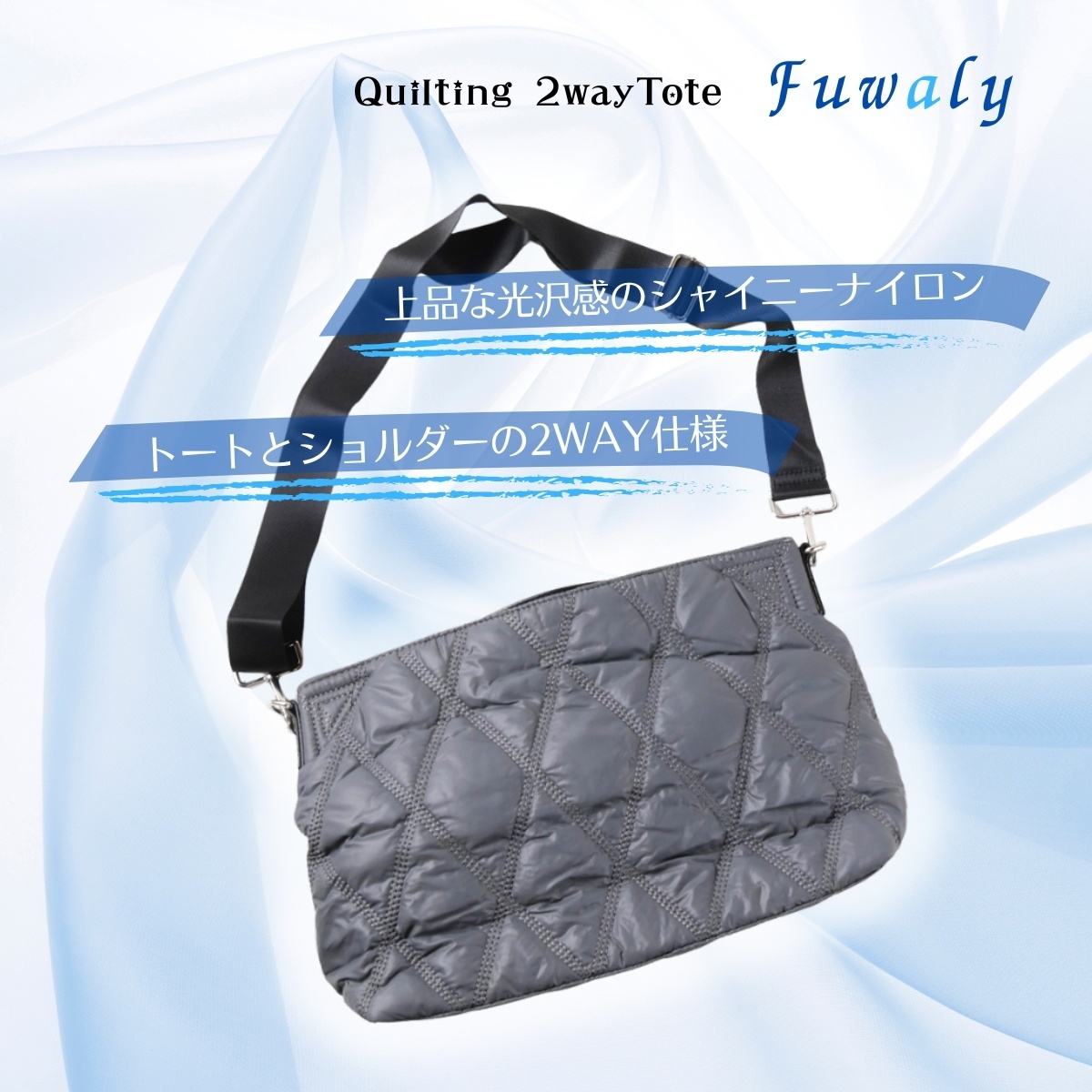 シャイニーナイロンの軽量キルティングトートバッグ。
