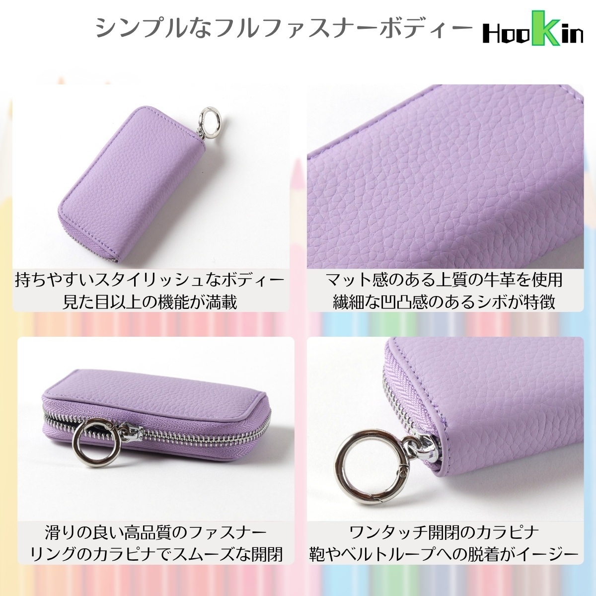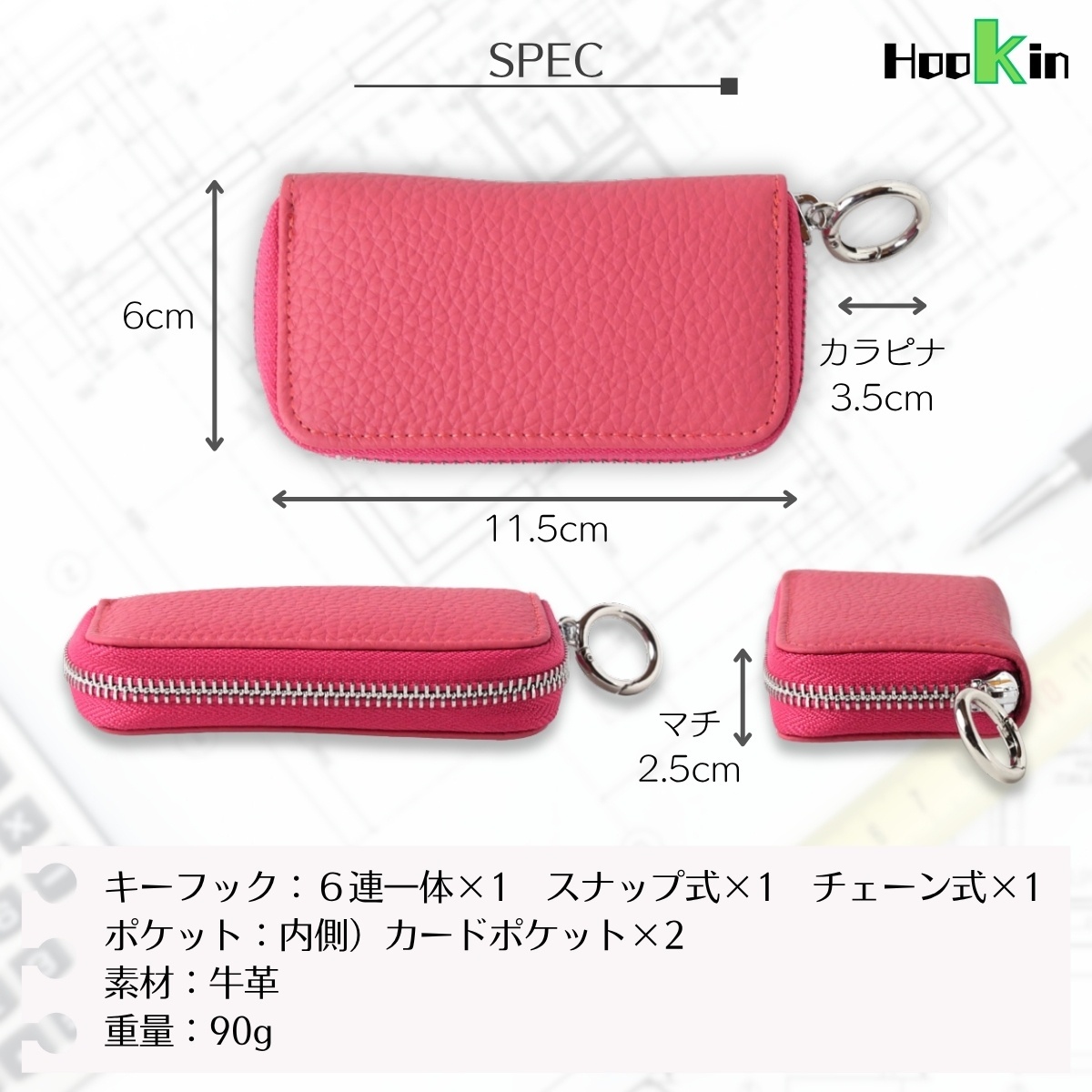 滑らかなファスナーを開けると中には、6連のキーフックに加え、着脱可能なキーリングとチェーン付きリングを装備。