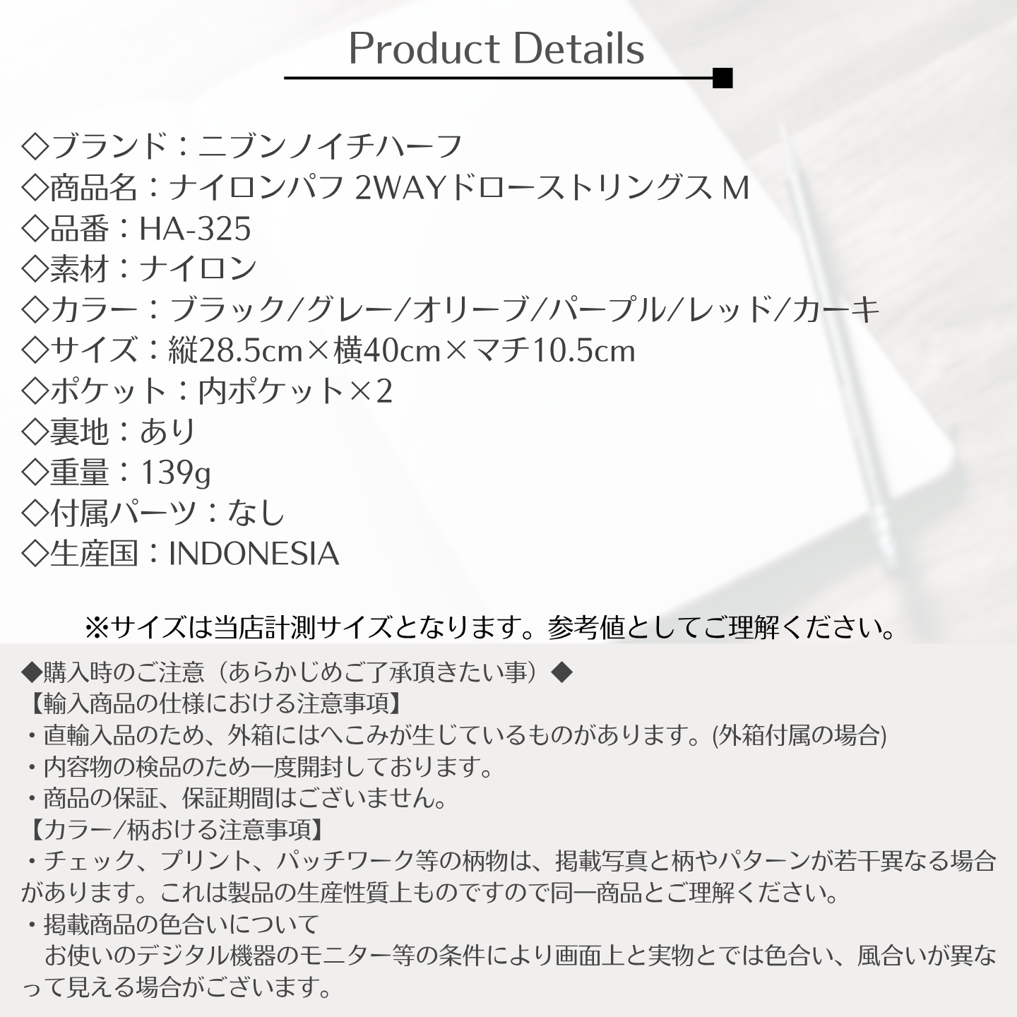 - > 1/2 HALF / ニブンノイチハーフ ナイロンパフ 2WAYドローストリングス M