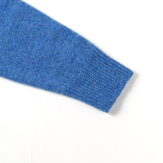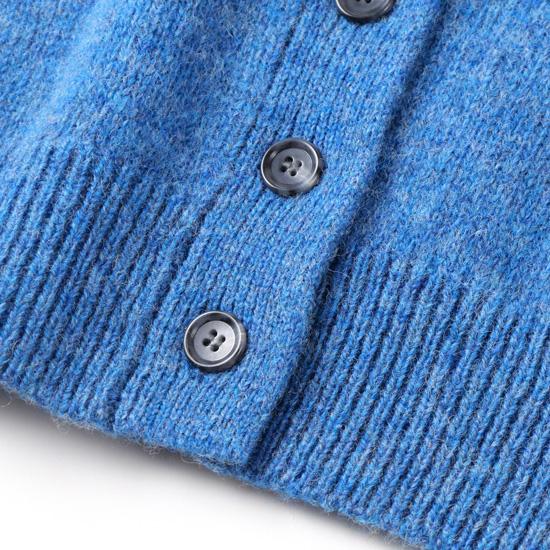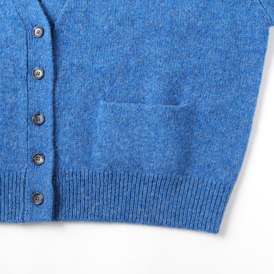 ウール100%のミドルゲージ糸で編み上げられた、暖かみのあるニットカーディガン。