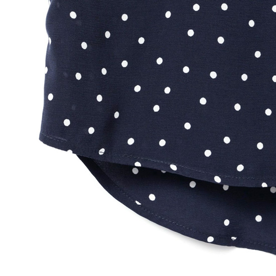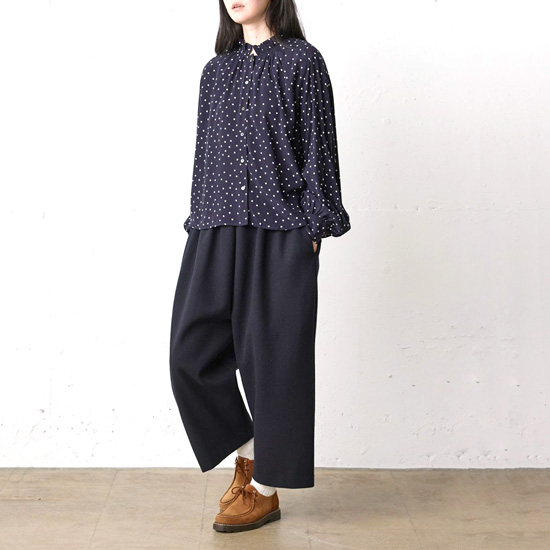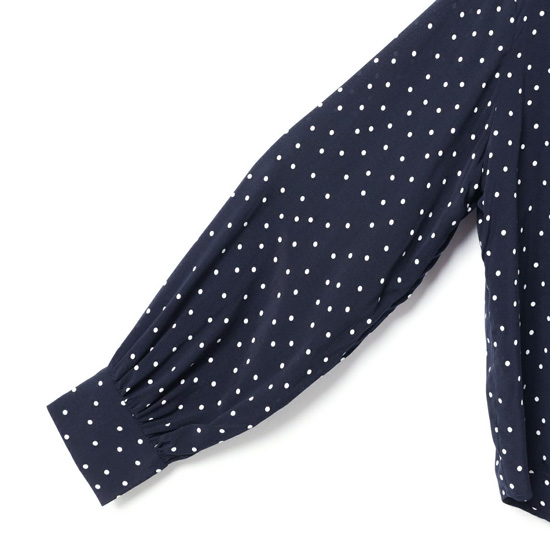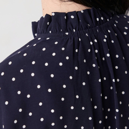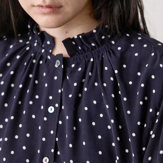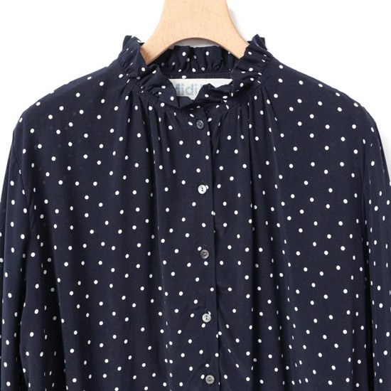 フリル襟とドット柄のコンビネーションが可愛いワイドシャツ。