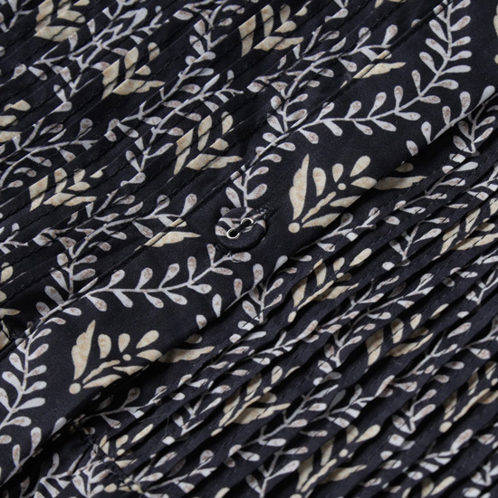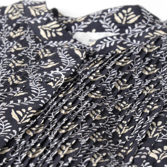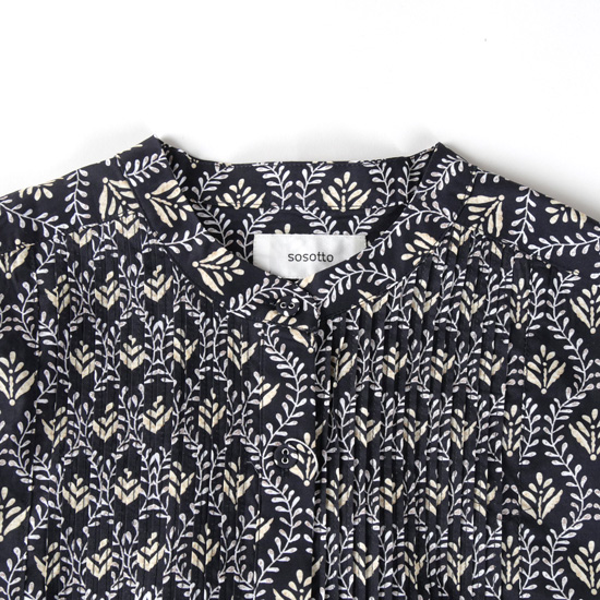 バンドカラーにくるみボタン、前身頃には人気の細かなピンタックを施しました。