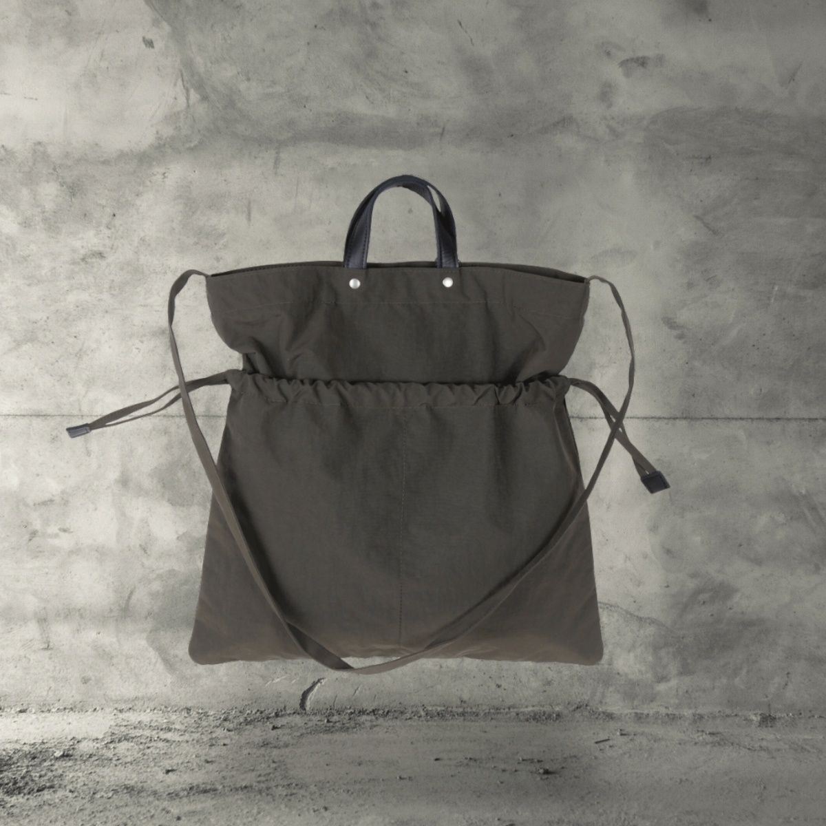 ヘルメットケースの様なデザインは、サイドの紐でソフトな印象の巾着バッグに変身します。