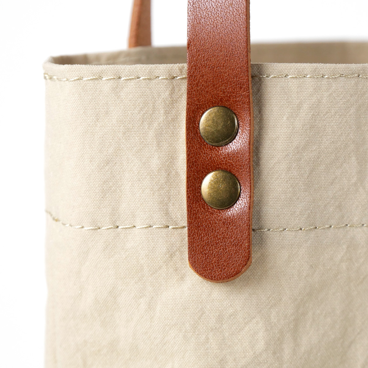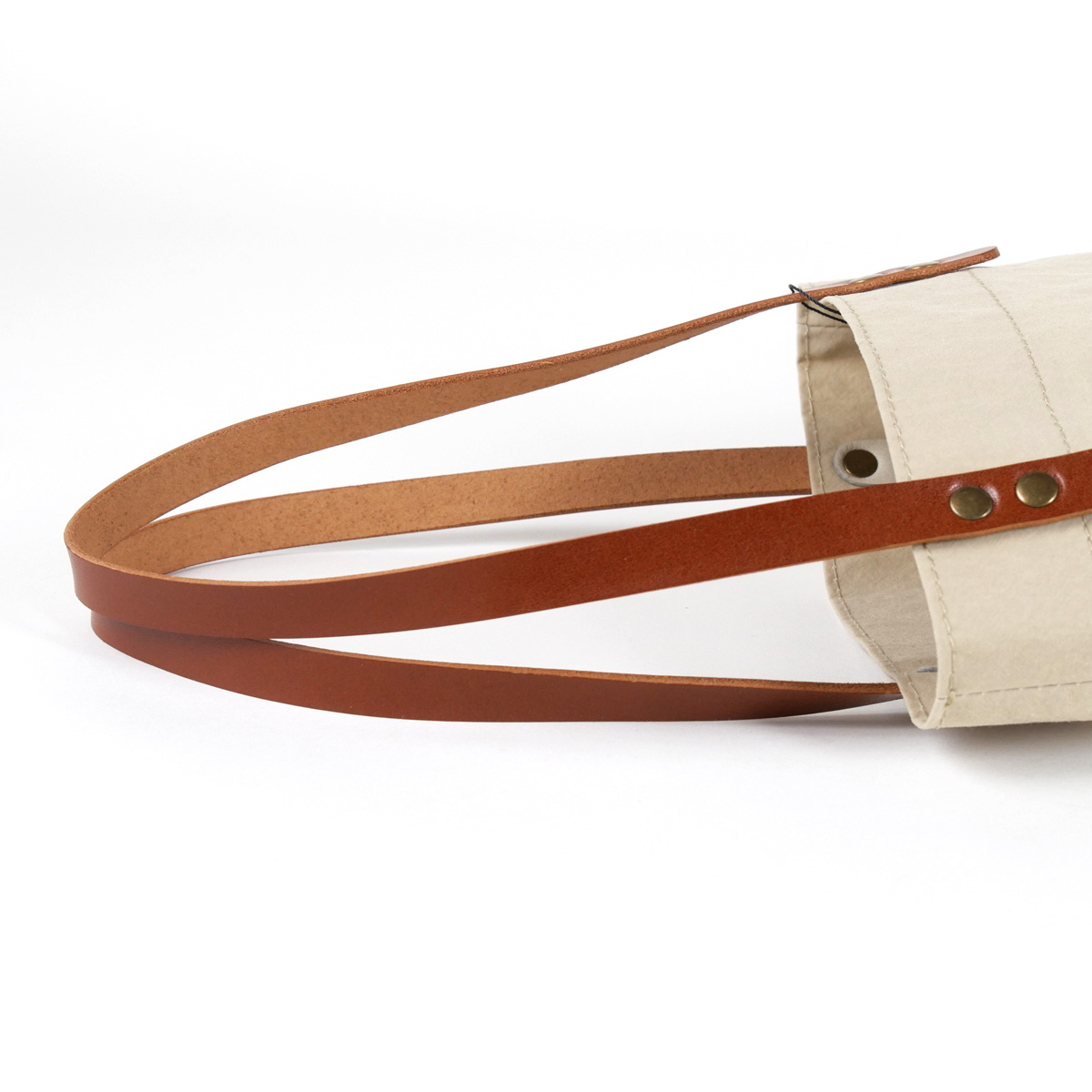 表のパッチポケットとハンドルは本革仕様。