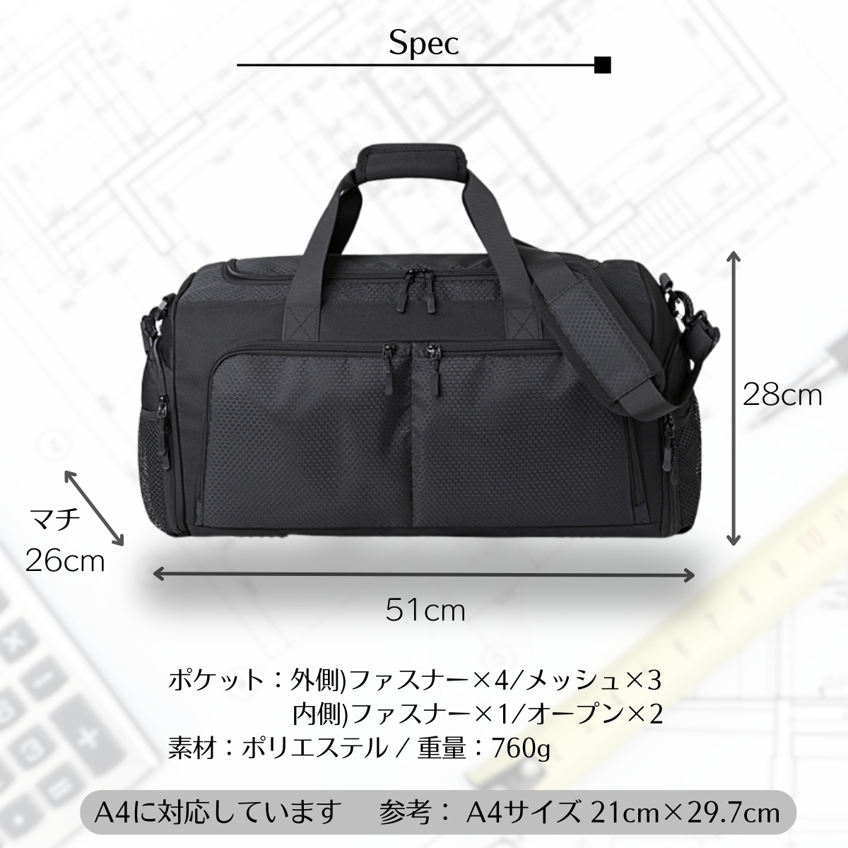 ジム通いや旅行、出張に最適な大容量の多機能バッグです。