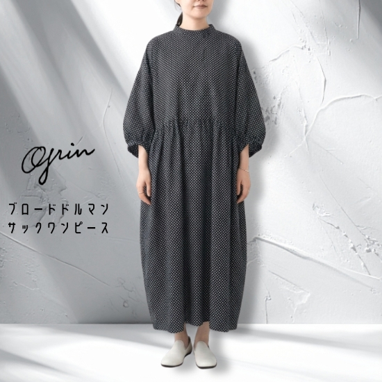 サックパターンは袋を手で持ち上げた様なイメージで、ふんわりとした上部から裾にかけて膨らみを緩やかに絞ったシルエットのこと。
