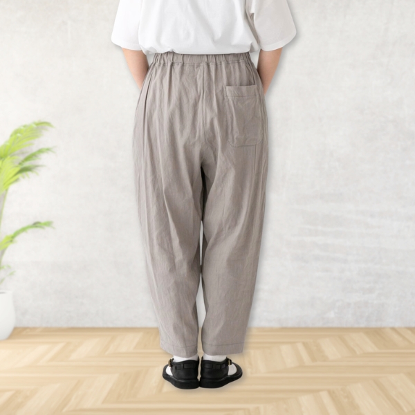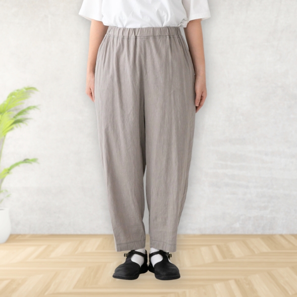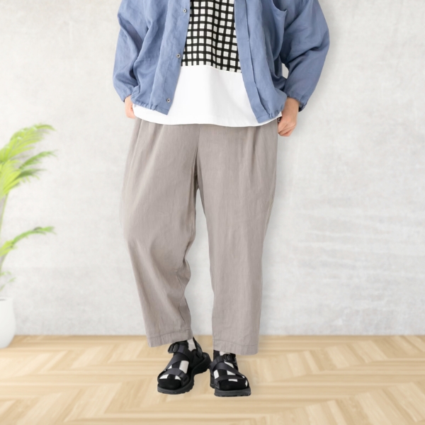麻のシャリ感と、滑らかな肌触りのレーヨンの混紡生地で仕立てたパンツ。
