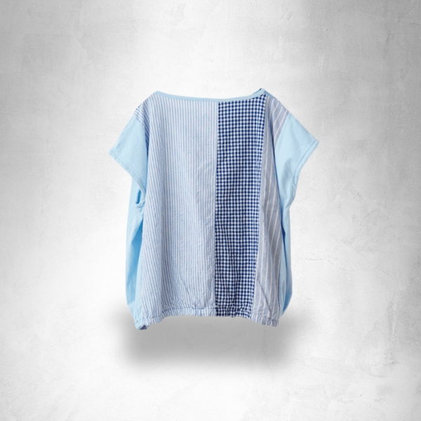 両サイドの柔らかな天竺生地に布帛の同系色のストライプやチェックなどのパターン柄をパネル状に組み合わせました。