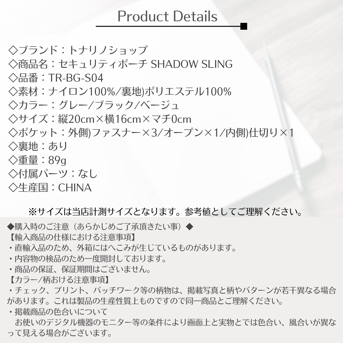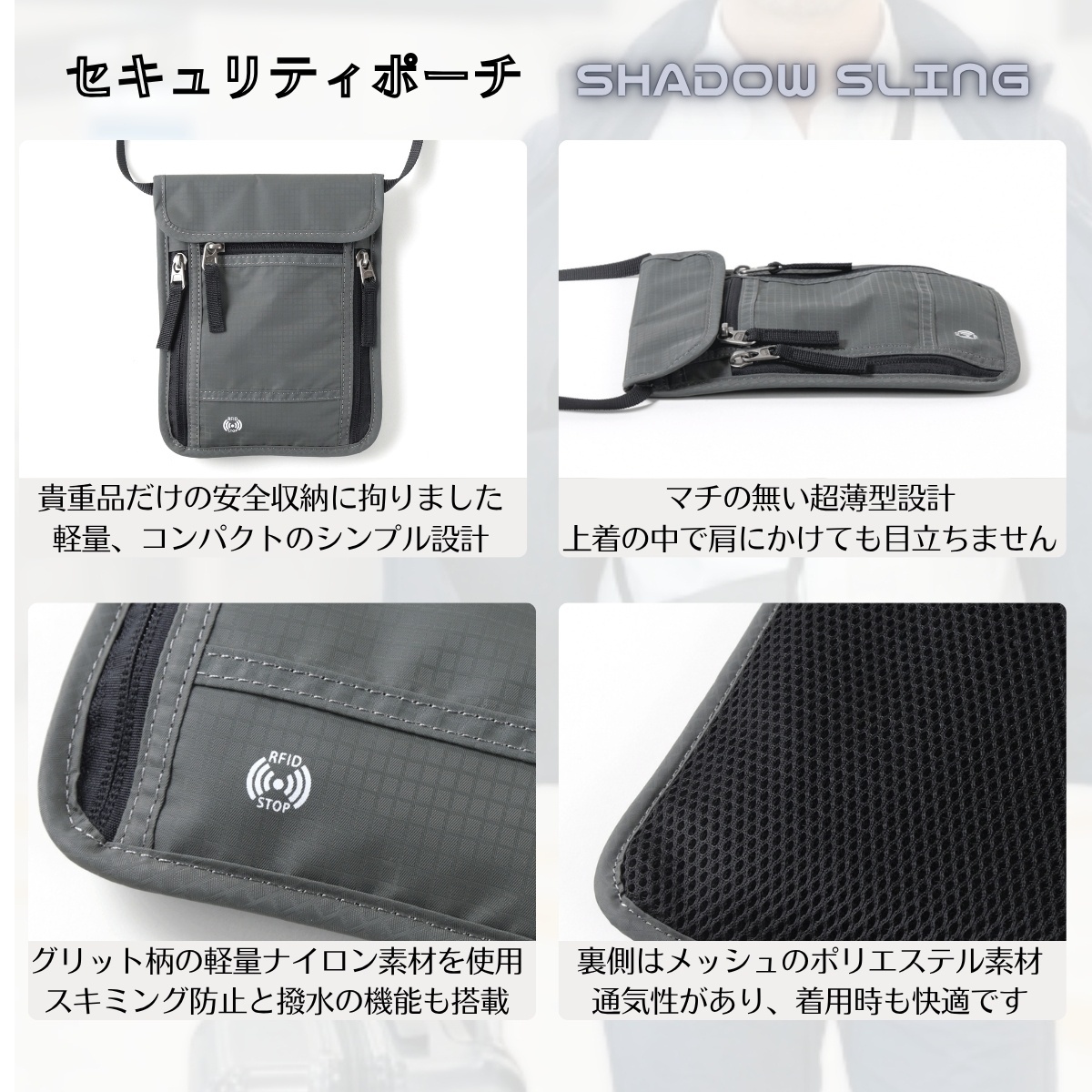 トナリノショップ セキュリティーポーチ SHADOW SLING ショルダーバッグ スキミング防止 RFIDブロッキング 超薄型 軽量 大容量6ポケット 斜め掛け 防水 貴重品入れ 海外旅行 防犯グッズ 男女兼用