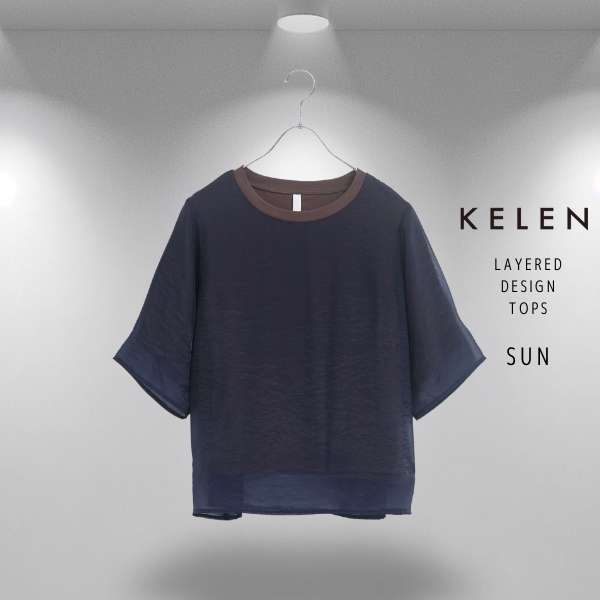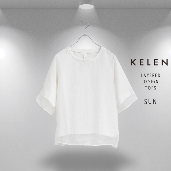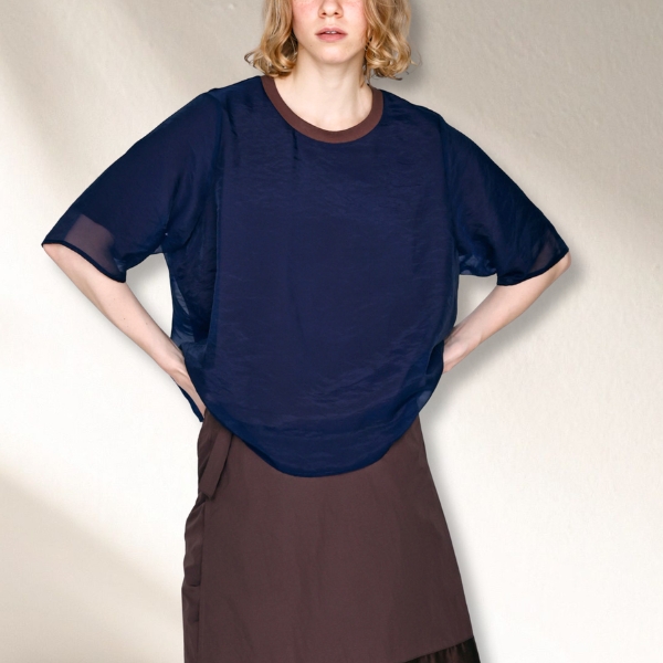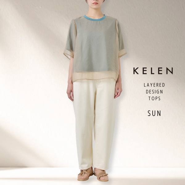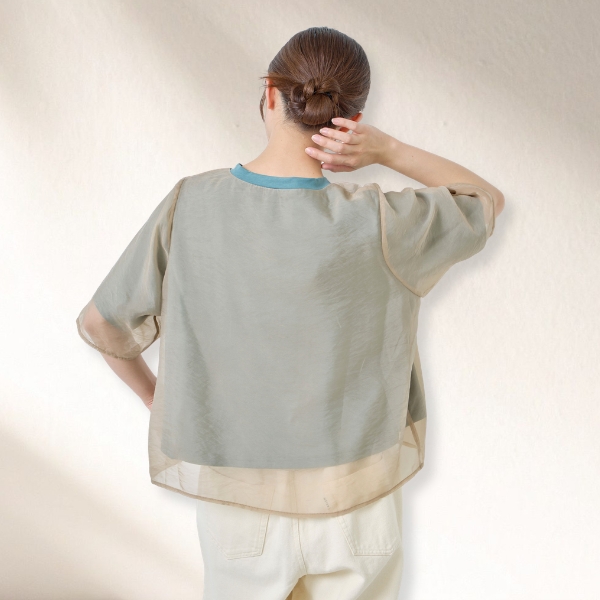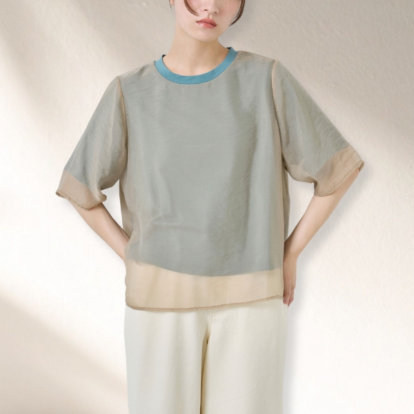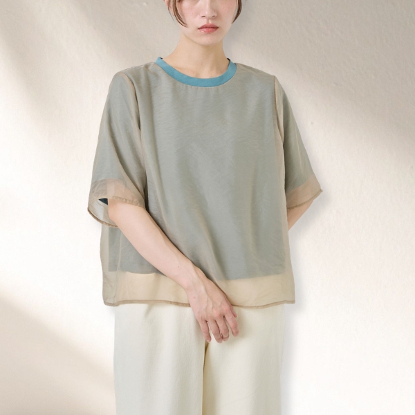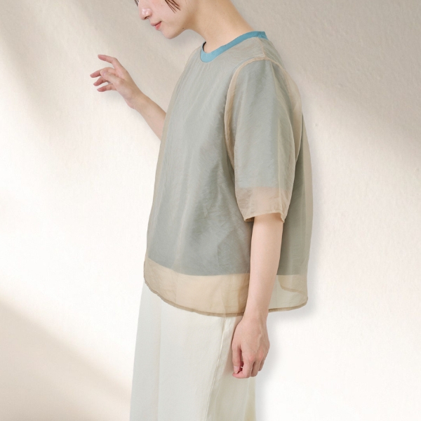 カットソーの上にオーガンジー素材を縫い合わせたレイヤードが印象的です。