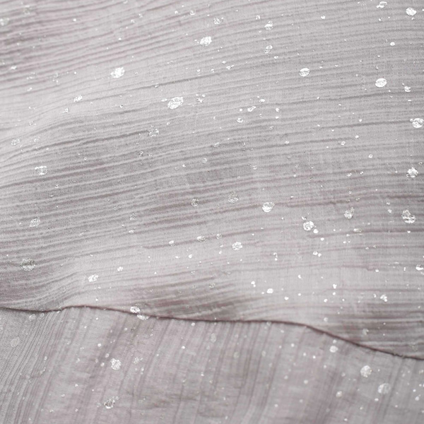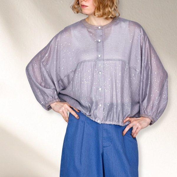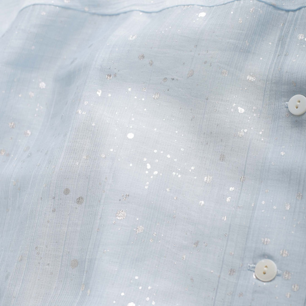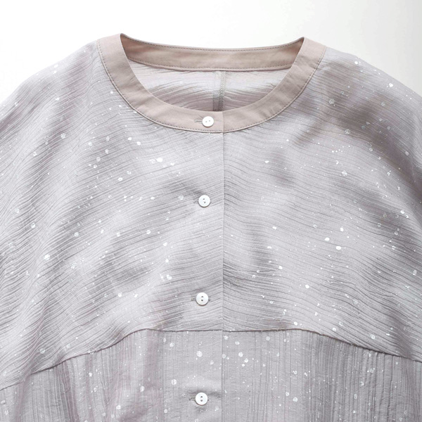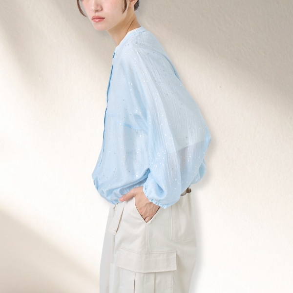 光沢感のあるシアー素材に、美しい箔プリントを施した印象的なデザイントップス。