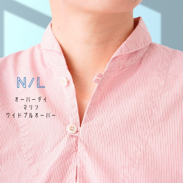 涼し気なピンクのピンストライプのワイドプルオーバー。